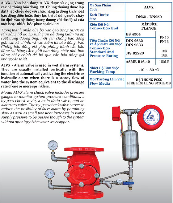 Van báo động ALVX được sử dụng trong các hệ thống báo động ướt. Chúng thường được lặp đặt theo chiều dọc với chức năng tự động hệ thống báo điện hoặc thủy lực kho có dòng nước ổn định vào hệ thông tương đương với tốt đố của một hoặc nhiều béc phun sprinklers.
